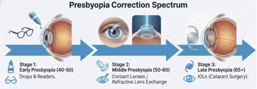 As cataracts develop, cataract surgery with a presbyopia‑correcting IOL usually becomes the most comprehensive option.