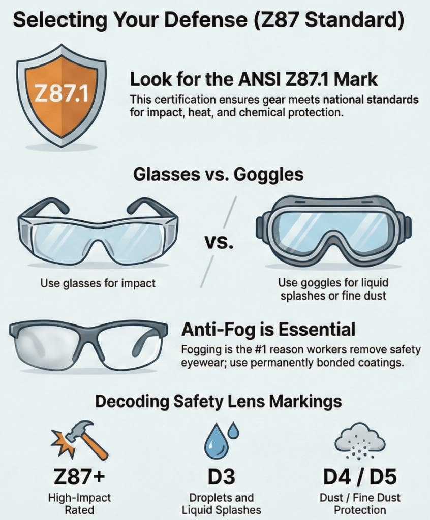For any activity involving grinding, drilling, or debris, look for eyewear marked CSA-approved or ANSI Z87.1+ for high-impact protection.