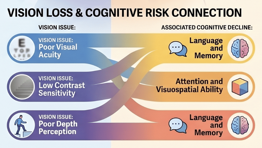 A long-term study following over 1,200 adults for 16 years found a strong link between vision loss and cognitive decline. In fact, older adults with impaired vision were found to have up to twice the risk of developing dementia or Alzheimer’s disease compared to those with healthy eyesight.