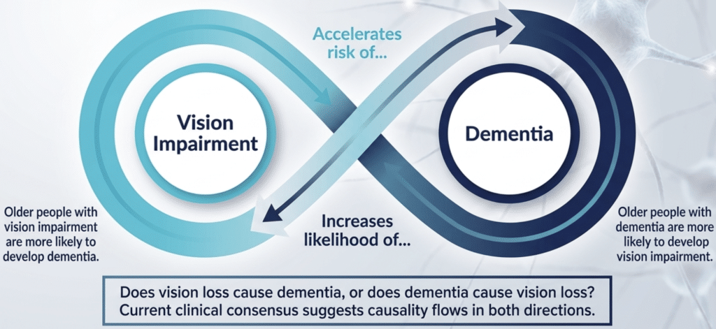 Researchers are still exploring whether vision loss causes cognitive decline or vice versa. Current evidence suggests the relationship goes both ways.