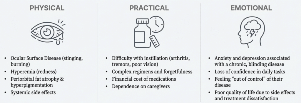 Furthermore the daily burden of drops extends far beyond the eye as it contributes to physical, practical, and emotional challenges.