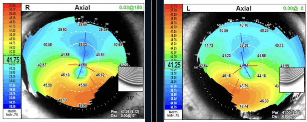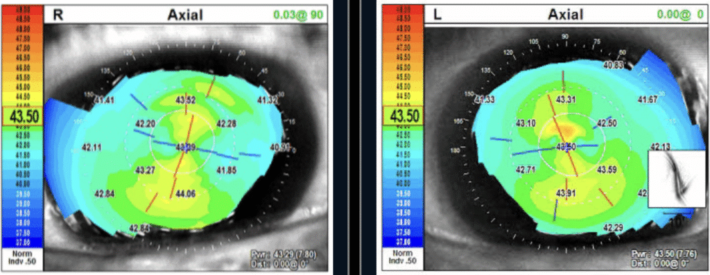 Corneal topography from OPD Scan III can show subtle surface irregularities and tear-film–related distortion, helping identify ocular surface disease and dry eye that may not be obvious on basic exam alone. OPD is useful for assessing how ocular surface disease impacts vision supporting both diagnosis and monitoring symptoms such as fluctuation in vision from dry eye.