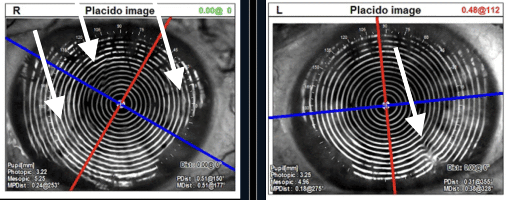 Arrows point to areas of surface irregularities of the tear film and/or corneal surface.